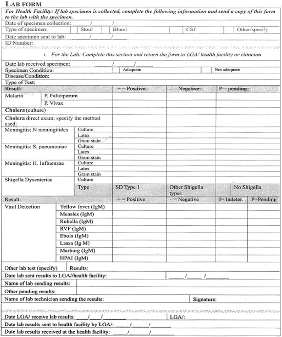 The Integrated Disease Surveillance and Response (IDSR) 001A form is used for immediate case-based reporting of notifiable diseases in Nigeria, when duly filled it should be sent immediately to the Local Government Area (LGA) Disease Surveillance focal person or team for documentation and possible action.